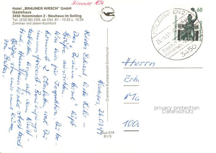 73197168 alte Postkarte Neuhaus Solling Hotel Brauner Hirsch Gaestehaus postalisch gelaufen Erhaltung siehe scans [FriedD77] KatCode: 11110003255023