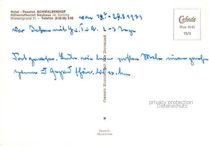 73856795 Neuhaus Solling Hotel Pension Schwalbenhof postalisch nicht gelaufen Erhaltung siehe scans [WerneD78] KatCode: 11110003255023