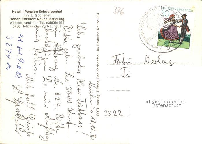 72607493 alte Postkarte Neuhaus Solling Hotel Schwalbenhof postalisch gelaufen Erhaltung siehe scans [NatalD47] KatCode: 11110003255023