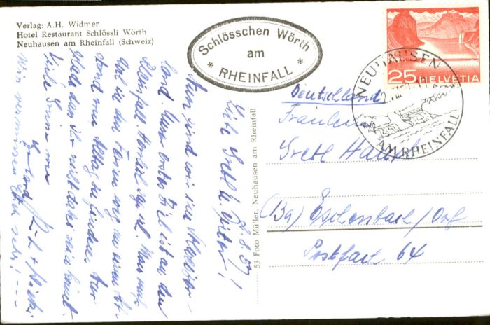 70793450 alte Postkarte Neuhausen SH Neuhausen Rheinfall Hotel Restaurant Schloessli postalisch gelaufen KatCode: 11470160460368