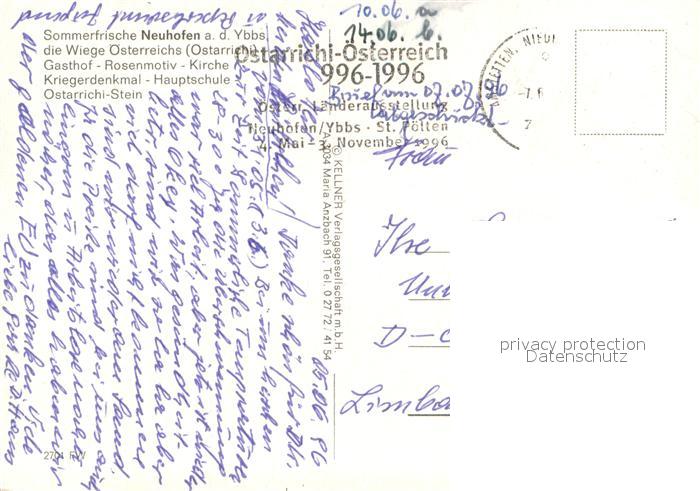73628972 alte Postkarte Neuhofen Ybbs Gasthof Rosenmotiv Kirche Kriegerdenkmal Hauptschule Ostarrichi Stein postalisch gelaufen Erhaltung siehe scans [WerneD78] KatCode: 11390121030520