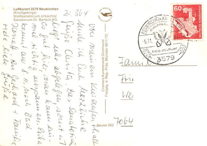 73935302 alte Postkarte Neukirchen Knuellgebirge Waldsanatorium Urbachtal und Klinik Dr Bartsch KG Fliegeraufnahme postalisch gelaufen Erhaltung siehe scans [FriedD77] KatCode: 11110006634017