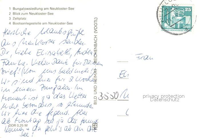 73777578 alte Postkarte Neukloster Mecklenburg Bungalowsiedlung am Neukloster See Zeltplatz Bootsanlegestelle postalisch gelaufen Erhaltung siehe scans [FriedD77] KatCode: 11110013058074