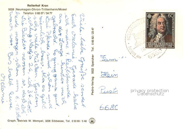 73641143 alte Postkarte Neumagen-Dhron Reiterhof Kron Koppel Reithalle Springen Bar postalisch gelaufen Erhaltung siehe scans [WerneD78] KatCode: 11110007231092