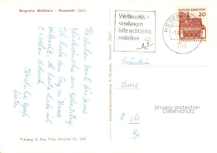 73584640 alte Postkarte Neumarkt Oberpfalz Fliegeraufnahme Burgruine Wolfstein postalisch gelaufen Erhaltung siehe scans [LiesaD40] KatCode: 11110009373147