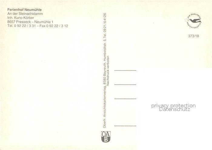 73050779 Neumuehle Presseck Ferienhof Steinachklamm postalisch nicht gelaufen Erhaltung siehe scans [KathaD81] KatCode: 11110009477148