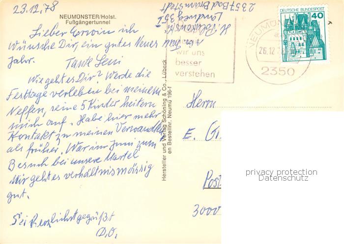 73763433 alte Postkarte Neumuenster Schleswig-Holstein Fussgaengertunnel postalisch gelaufen Erhaltung siehe scans [LiesaD40] KatCode: 11110001004000