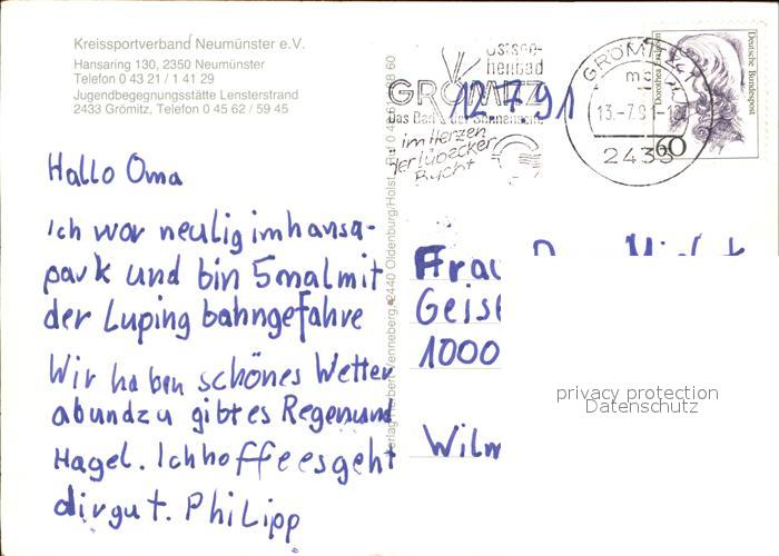 72580518 alte Postkarte Neumuenster Schleswig-Holstein Kreissportverband Jugendbegegnungsstaette Groemitz postalisch gelaufen Erhaltung siehe scans [KathaD79] KatCode: 11110001004000