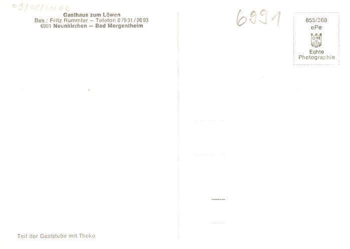 73887255 Neunkirchen Bad Mergentheim Gasthaus zum Loewen postalisch nicht gelaufen Erhaltung siehe scans [FriedD77] KatCode: 11110008128007