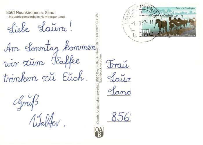 73884434 alte Postkarte Neunkirchen Sand Kirchen Ortspartie Brunnen Rathaus postalisch gelaufen Erhaltung siehe scans [WerneD78] KatCode: 11110009574141