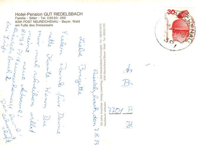 73892739 alte Postkarte Neureichenau Bayern Hotel Pension Gut Riedelsbach Speiseraum Gaestezimmer Schwimmbad Dreisessel postalisch gelaufen Erhaltung siehe scans [FriedD77] KatCode: 11110009272136