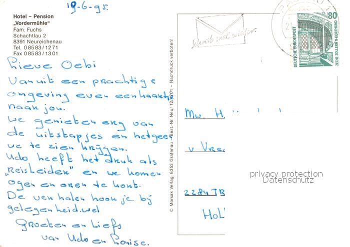 72935715 alte Postkarte Neureichenau Hotel Pension Vordermuehle Landschaftspanorama postalisch gelaufen Erhaltung siehe scans [FriedD77] KatCode: 11110009272136