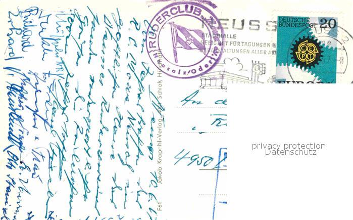 72842140 alte Postkarte Neuss Hafen Rosengarten Stadthalle St Quirinus Kirche Stadtgarten Berliner Platz Eierdieb Statue Drususplatz postalisch gelaufen Erhaltung siehe scans [FriedD77] KatCode: 11110005162024
