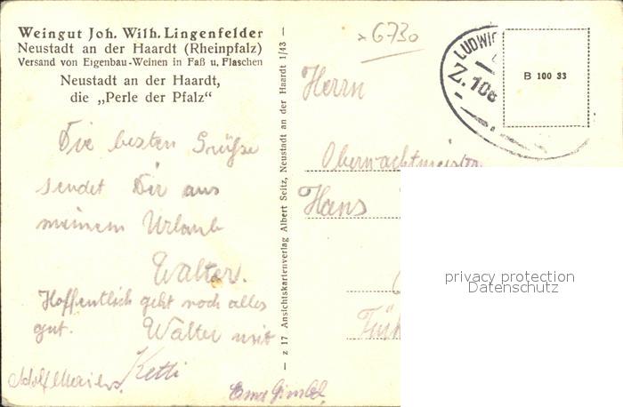 41786159 alte Postkarte Neustadt Haardt Weingut Lingenfelder Ausschank Bahnpost postalisch gelaufen Erhaltung siehe scans KatCode: 11110007316000
