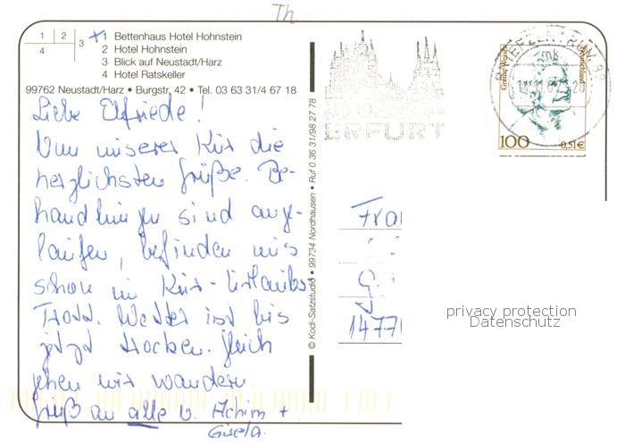 73758543 alte Postkarte Neustadt Harz Bettenhaus Hotel Hohnstein Hotel Ratskeller Panorama postalisch gelaufen Erhaltung siehe scans [FriedD77] KatCode: 11110016062036