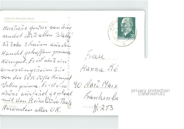 72384048 alte Postkarte Neustadt Harz FDGB- Erholungsheim Haus zur Sonne postalisch gelaufen Erhaltung siehe scans KatCode: 11110016062036