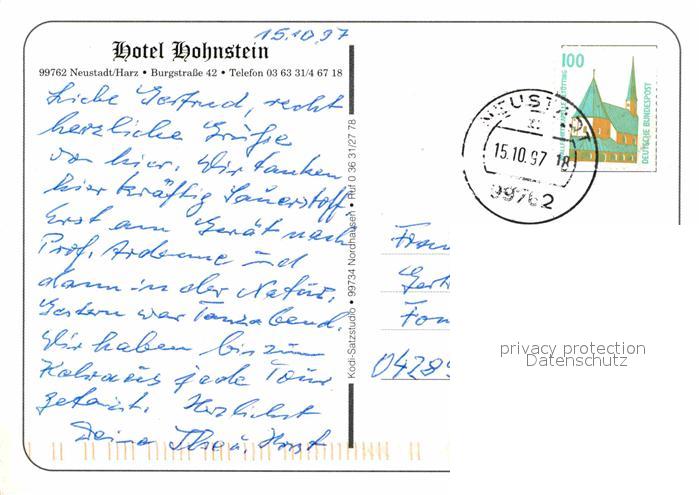 72753309 alte Postkarte Neustadt Harz Hotel Hohnstein Fachwerkhaus postalisch gelaufen Erhaltung siehe scans [FriedD77] KatCode: 11110016062036