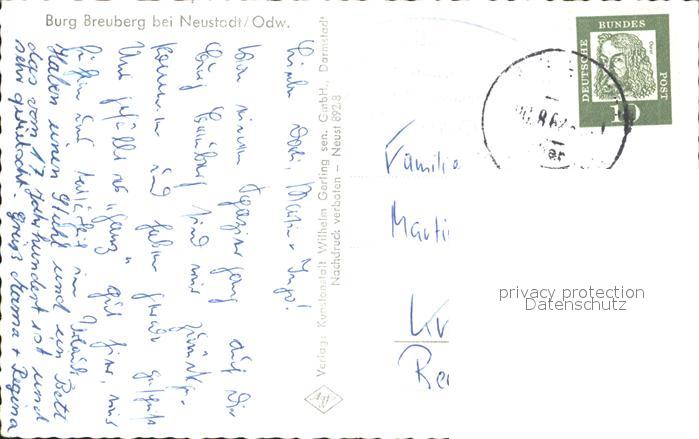 72098624 alte Postkarte Neustadt Odenwald Burg Breuberg postalisch gelaufen Erhaltung siehe scans KatCode: 11110006437004