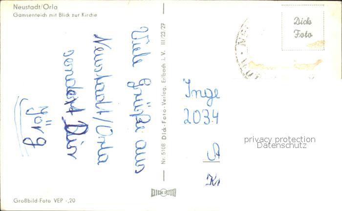 71983698 alte Postkarte Neustadt Orla Gamsenteich mit Blick zur Kirche postalisch gelaufen Erhaltung siehe scans KatCode: 11110016075073