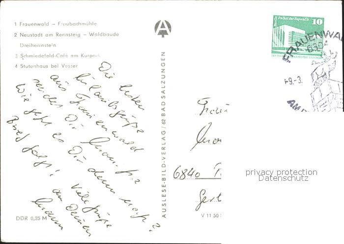 72024725 alte Postkarte Neustadt Rennsteig Frauenwald Fraubachmuehle Waldbaude Schmiedefeld Stutenhaus bei Vesser postalisch gelaufen Erhaltung siehe scans KatCode: 11110016070038