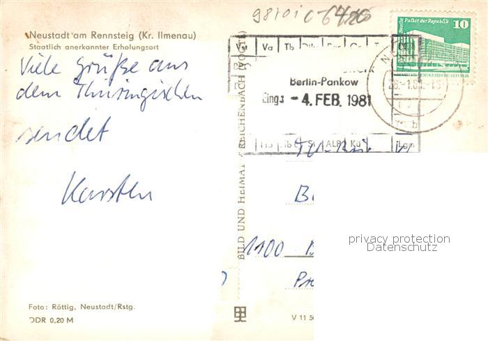 73854412 alte Postkarte Neustadt Rennsteig Ortszentrum mit Kirche Erholungsort im Winter postalisch gelaufen Erhaltung siehe scans [FriedD77] KatCode: 11110016070038