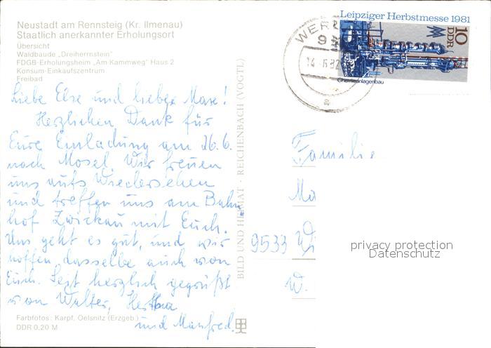 72247729 alte Postkarte Neustadt Rennsteig Panorama Waldbaude Dreiherrnstein FDGB Erholungsheim Am Kammweg Konsum Einkaufszentrum Freibad postalisch gelaufen Erhaltung siehe scans KatCode: 11110016070038