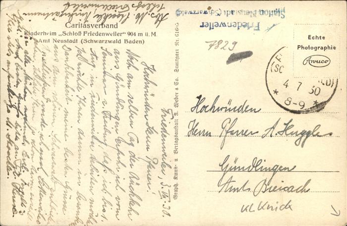71370708 alte Postkarte Neustadt Schwarzwald Caritasverband Kinderheim Schloss Friedenweiler postalisch gelaufen Erhaltung mit Maengel KatCode: 11110008315113