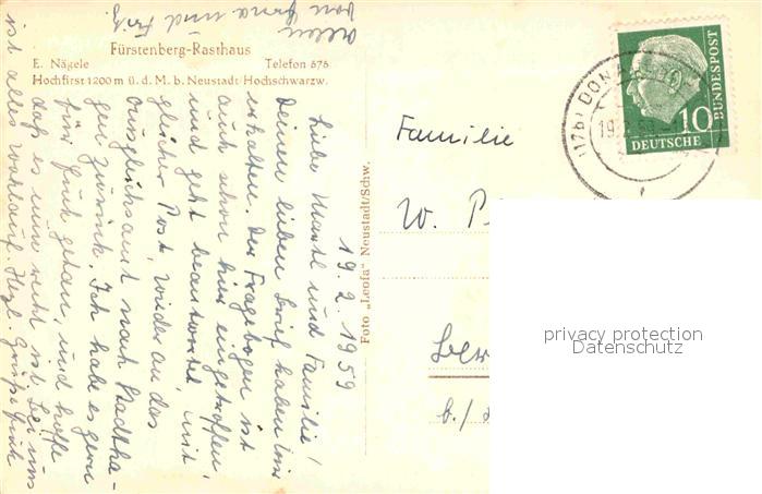 72814251 alte Postkarte Neustadt Schwarzwald Fuerstenberg Rasthaus postalisch gelaufen Erhaltung siehe scans [AndreD76] KatCode: 11110008315113