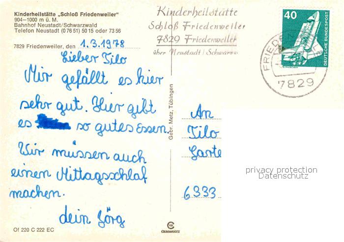 72751053 alte Postkarte Neustadt Schwarzwald Kinderheilstaette Schloss Friedenweiler postalisch gelaufen Erhaltung siehe scans [AndreD76] KatCode: 11110008315113