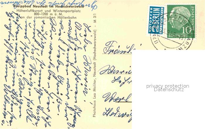 72754400 alte Postkarte Neustadt Schwarzwald Kneippbad Hoehenluftkurort Wintersportplatz an der romantischen Hoellenbahn postalisch gelaufen Erhaltung siehe scans [FriedD77] KatCode: 11110008315113