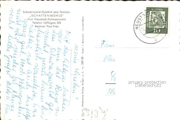 72583431 alte Postkarte Neustadt Schwarzwald Schwarzwald-Gasthof und Pension Schattenmuehle postalisch gelaufen Erhaltung siehe scans [LiesaD40] KatCode: 11110008315113