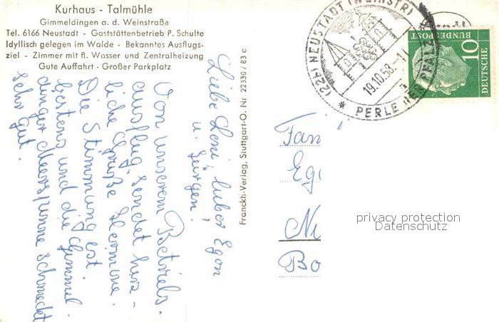 72885099 alte Postkarte Neustadt Wied Kurhaus Talmuehle Gimmeldinger Tal Teich postalisch gelaufen Erhaltung siehe scans [FriedD77] KatCode: 11110007138044