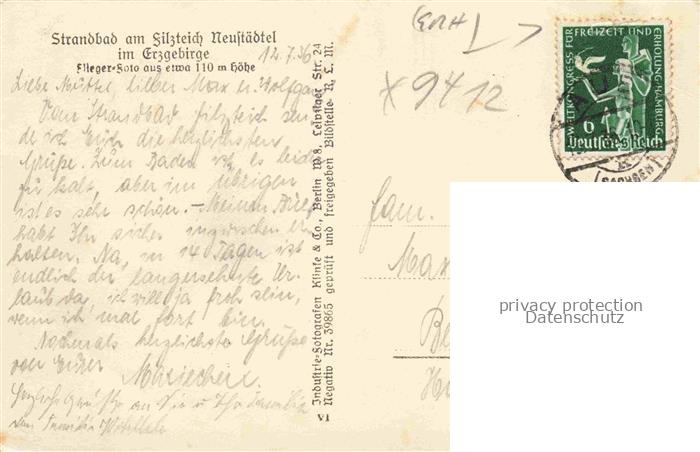 74044845 alte Postkarte Neustaedtel Erzgebirge Sachsen Strandbad am Filzteich postalisch gelaufen Fliegeraufnahme Erhaltung siehe scans [FriedD77] KatCode: 11110014191280