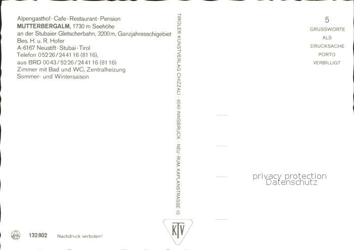 72179909 Neustift Stubaital Tirol Alpengasthof Mutterbergalm Luftseilbahn postalisch nicht gelaufen Erhaltung siehe scans KatCode: 11390332070334