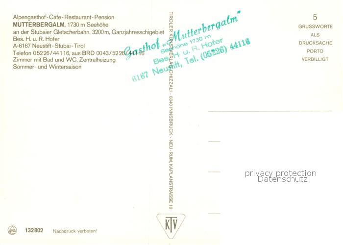 73046405 Neustift Stubaital Tirol Alpengasthof Mutterbergalm postalisch nicht gelaufen Erhaltung siehe scans [KathaD81] KatCode: 11390332070334