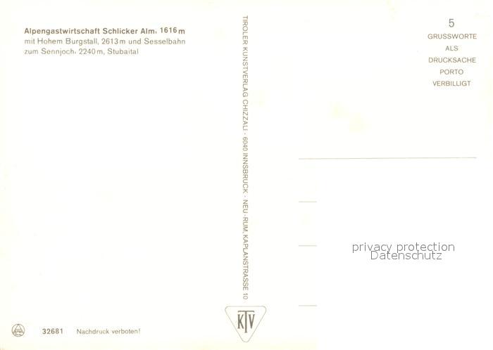 13235958 Neustift Stubaital Tirol Alpengastwirtschaft Schlicker Alm Hoher Burgstall Stubaier Alpen postalisch nicht gelaufen Erhaltung siehe scans [FriedD77] KatCode: 11390332070334