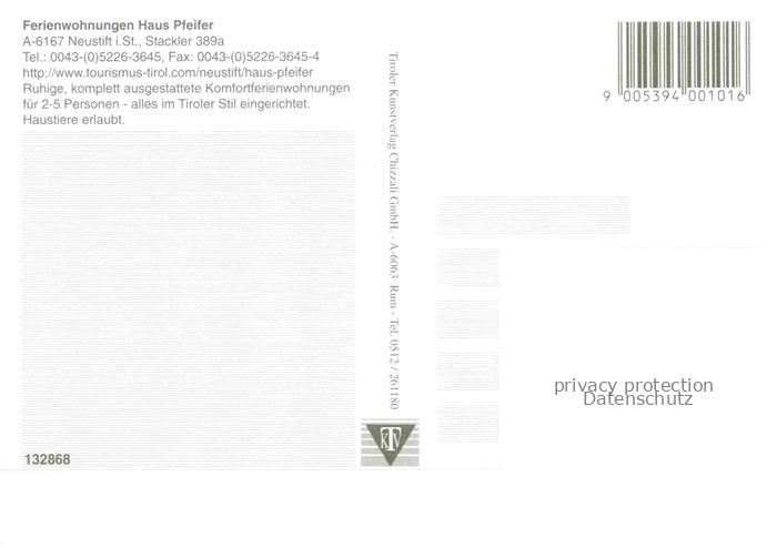74096037 Neustift Stubaital Tirol AT Haus Pfeifer Ferienwohnungen postalisch nicht gelaufen Erhaltung siehe scans [WerneD78] KatCode: 11390332070334