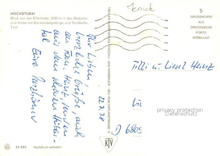 73070471 alte Postkarte Neustift Stubaital Tirol Blick von der Elferhuette ins Stubaital und Inntal Karwendelgebirge Nordkette postalisch gelaufen Erhaltung siehe scans [FriedD77] KatCode: 11390332070334