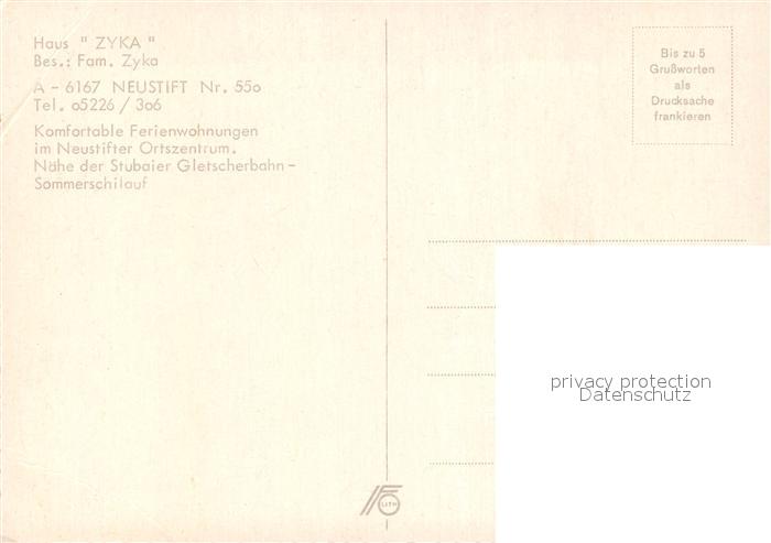 13101835 Neustift Stubaital Tirol Ferienwohnungen Haus Zyka postalisch nicht gelaufen Erhaltung siehe scans [NatalD47] KatCode: 11390332070334