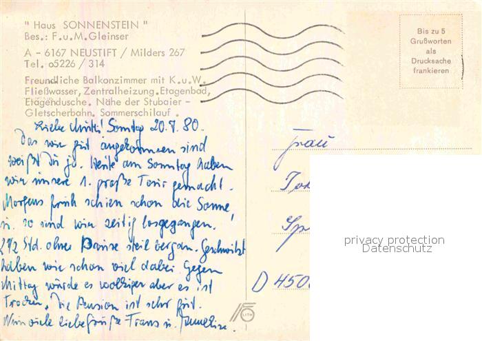 12869927 alte Postkarte Neustift Stubaital Tirol Haus Sonnenstein postalisch gelaufen Erhaltung siehe scans [PaolaD17] KatCode: 11390332070334