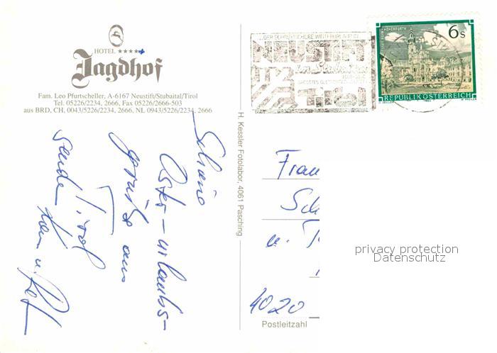 12789620 alte Postkarte Neustift Stubaital Tirol Hotel Jagdhof bei Nacht postalisch gelaufen Erhaltung siehe scans [WerneD78] KatCode: 11390332070334