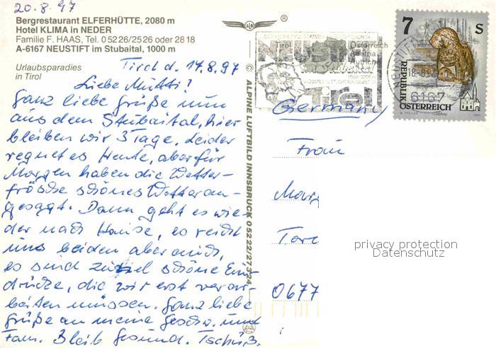 12637477 alte Postkarte Neustift Stubaital Tirol Hotel Klima in Neder Bergrestaurant Elferhuette postalisch gelaufen Erhaltung siehe scans [LiesaD40] KatCode: 11390332070334