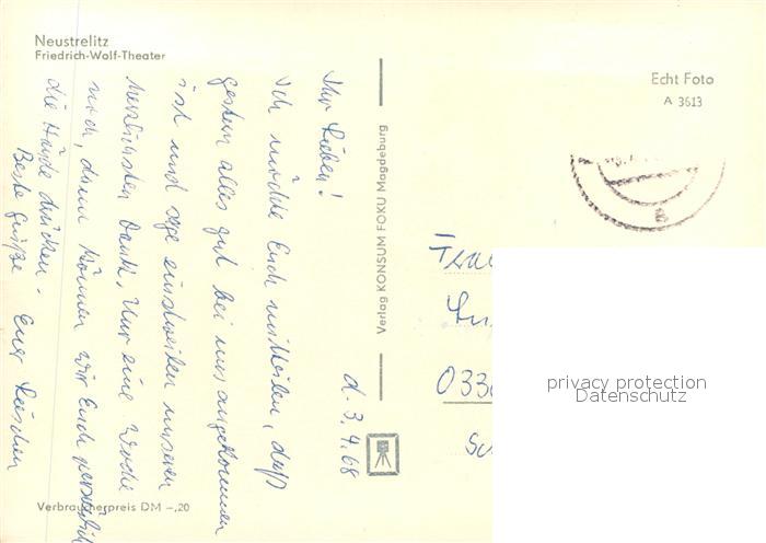 72951637 alte Postkarte Neustrelitz Friedrich Wolf Theater postalisch gelaufen Erhaltung siehe scans [FriedD77] KatCode: 11110013055050