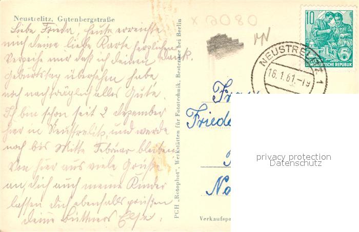 72982668 alte Postkarte Neustrelitz Gutenbergstrasse Statuen postalisch gelaufen Erhaltung siehe scans [FriedD77] KatCode: 11110013055050