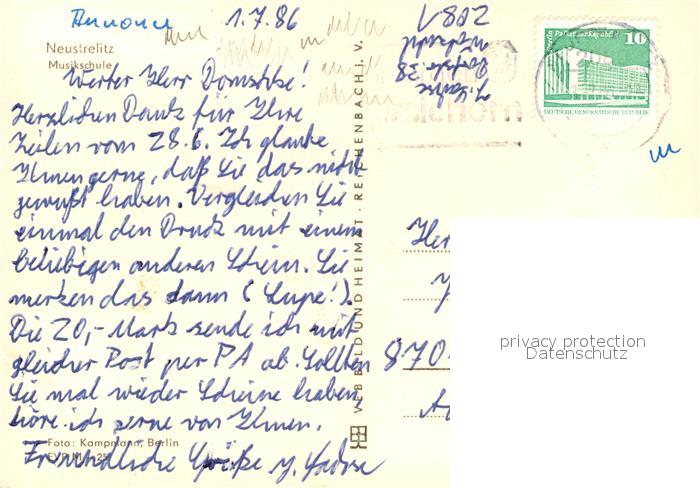 73134976 alte Postkarte Neustrelitz Musikschule Denkmal Statue postalisch gelaufen Erhaltung siehe scans [FriedD77] KatCode: 11110013055050
