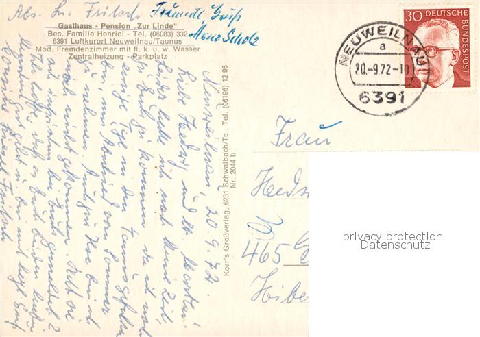 73812825 alte Postkarte Neuweilnau Gasthaus Pension Zur Linde Panorama postalisch gelaufen Erhaltung siehe scans [WerneD78] KatCode: 11110006434013