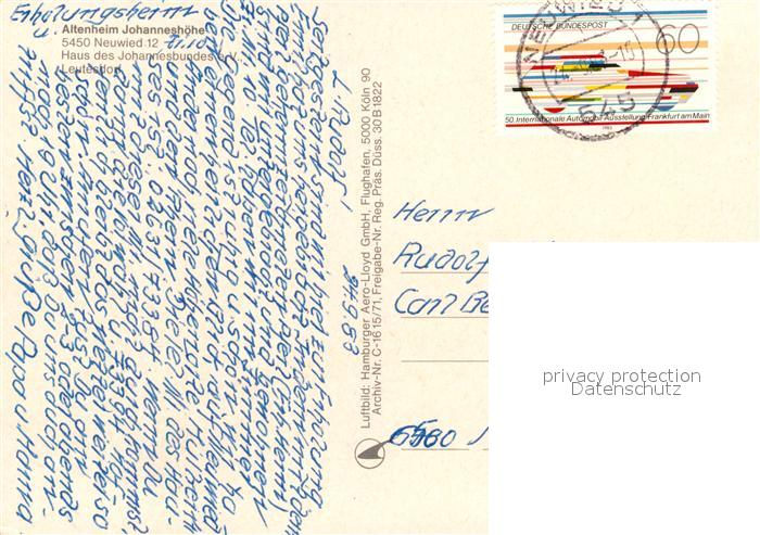 73080463 alte Postkarte Neuwied Rhein Altenheim Johanneshoehe Fliegeraufnahme postalisch gelaufen Erhaltung siehe scans [FriedD77] KatCode: 11110007138045