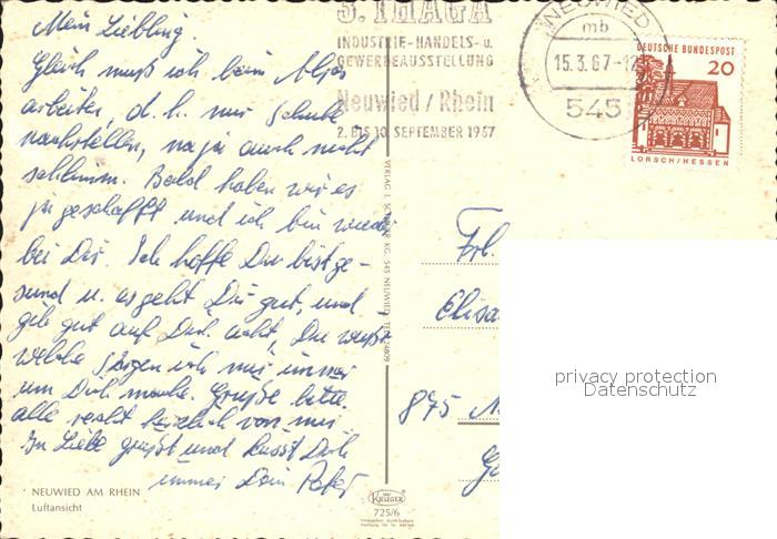 72060163 alte Postkarte Neuwied Rhein LuftaufnahmeBruecke postalisch gelaufen Erhaltung siehe scans KatCode: 11110007138045