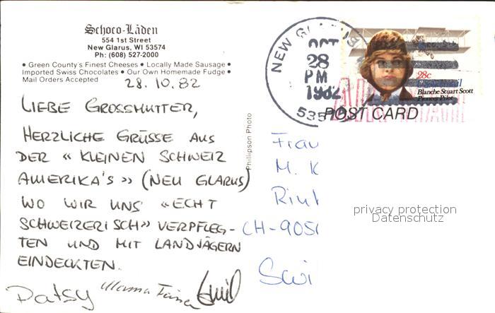 11688103 old postcard New Glarus Schoco Laden Flagge postalisch gelaufen Erhaltung siehe scans KatCode: 14140520000000