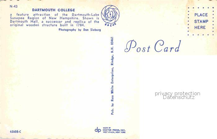 72904670 New Hampshire Dartmouth College Hall postalisch nicht gelaufen Erhaltung siehe scans [FriedD77] KatCode: 14140370000000